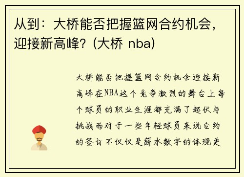 大桥能否把握篮网合约机会,迎接新高峰? 在NBA这个竞争激烈的舞台上,每个球员的职业生涯都充满了起伏与挑战。而对于一些年轻球员来说,合约的签订不仅仅是薪水数字的体现,更是职业生涯发展中的一次重大机遇。...