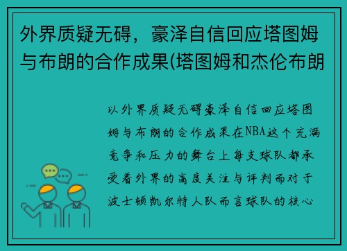 以外界质疑无碍,豪泽自信回应塔图姆与布朗的合作成果 在NBA这个充满竞争和压力的舞台上,每支球队都承受着外界的高度关注与评判。而对于波士顿凯尔特人队而言,球队的核心阵容和球员之间的化学反应,时常成为...